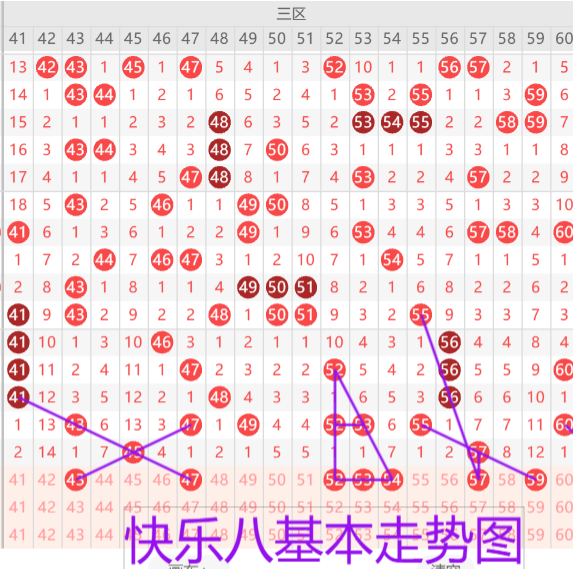 我们来看下四区的基本走势情况,上期开出了两枚开奖号码,本期预计开出4-5枚开奖号码,首先我们爱看43 47的交叉走势建议二选一。52 53 54如图所示中的空位去三角形形态123.可以考虑三连。57的三斜连重号。重点防守遗漏12期的19开出。