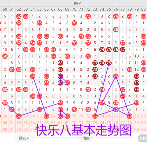 我们来看下四区的基本走势情况,上期卡出了六枚开奖号码,本期预计开出4-5枚开奖号码,首先我们来看62 66的双码三斜连形态建议二选一。68 69的三角形复制形态。73的双线三斜连。78的双线三斜连 73 78建议二选一。