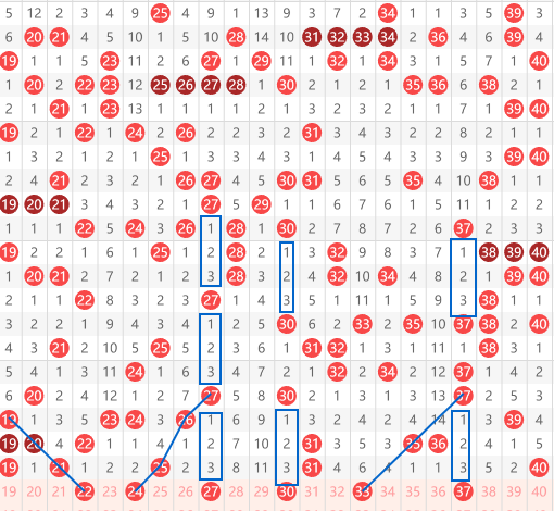 快乐8第070期20~40区域,推荐第一个号码是22.本身是个四斜连,然后22间隔对称走势,商米有个相同的走势19-22结合23到21的交叉, 然后是24的走势 我们看到27斜着26,间隔一期出25带出24的吊角斜连走势,27我们看到是个间隔3的对称走势,还具备一个25间隔二开26然后间隔二开27的间隔二斜连走势.下来就是30一个间隔三 然后间隔二,然后再间隔三的对称走势,还有33提个37-33的间隔一斜连走势,最后就是37的对称走势