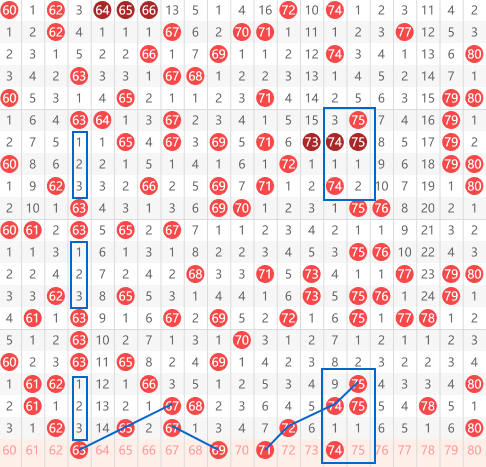 快乐8第2026070期61-80区域:推荐的第一个号码是63。没看到63本身是一个间隔三的连贯走势,然后就是65跟63的走势关系,大家可以看到再走势图上 63跟65基本上保持着斜的走势,要么63下一期开65.要么65下一期开63、同时还具备一个67间隔一期开65然后再间隔一期开63的间隔一斜连。然后是69号,一个67到69的鞋莲,以及它本身的间隔3的一个走势图。最后就是71和74这两个号码,71我们可以看到75斜开74,然后间隔一给72,再开71的吊角对称走势。74蓝色方框标注上面的走势和下面的走势完全相同。