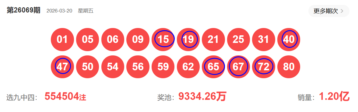 快乐8第069期开奖如下