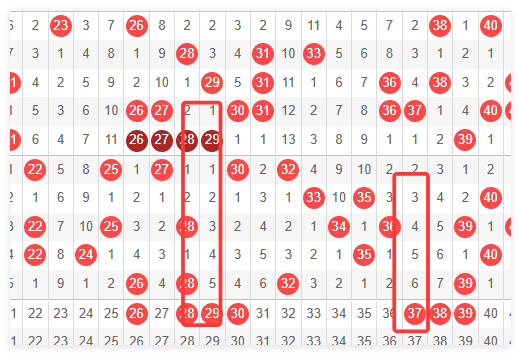 接着我们一起看一下20~40这个区间。20~40上一期开出了四个号码,那么本期的话,我们还是要注意一下重号二六二八二九三十。嗯,这个点位呢,还是有可能会进行重复的。嗯,特别是262829,大家要重点的去关注一下373839这个点位呢,要取决于39号这个点,这个号码是否会进行重复直落。如果重复直落的话,这个号码很可能会形成一个三联。 关注从二区延伸至三区的斜连码,以及三区内部可能形成的隔期连号。