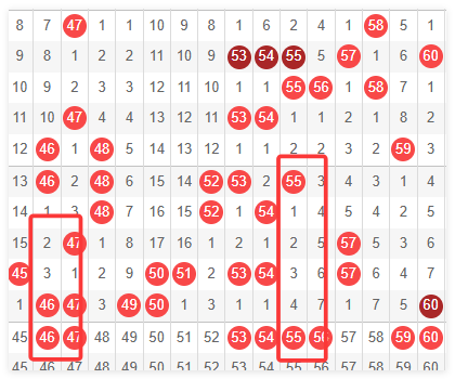 接着,我们看一下40~60这个区间呢,上期开出了7个号码,那么本期的话,我们还是要注意重号,特别是4647这个点位,我们要防止一下4647,特别是47号呢,有可能会形成一个斜连号的一个几个点。然后还要看一下53 54 55 56这个点呢,也有可能会进行一个号码的一个关键的组合点。