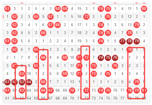 最后,大家看一下这个60~80这个区间,60~80这个区间的话,开出了5连号。5连号的话,要注意一下重号,特别是606163。其次要看一下这个69啊,79这个同为的一个开出。其次要防一下707274这个地方呢,有可能会形成一个偶数的一个组合号码。嗯,关键的三连号787980本期的话也要防一下,就可能会开出。这是整个四大第四大分区的一个号码的一个分析。关注近期在一区内频繁出现的号码,如上期开出的号码,或有连续开出记录的号码。例如,如果 63 53 54 近期表现活跃,可作为重点关注对象。
