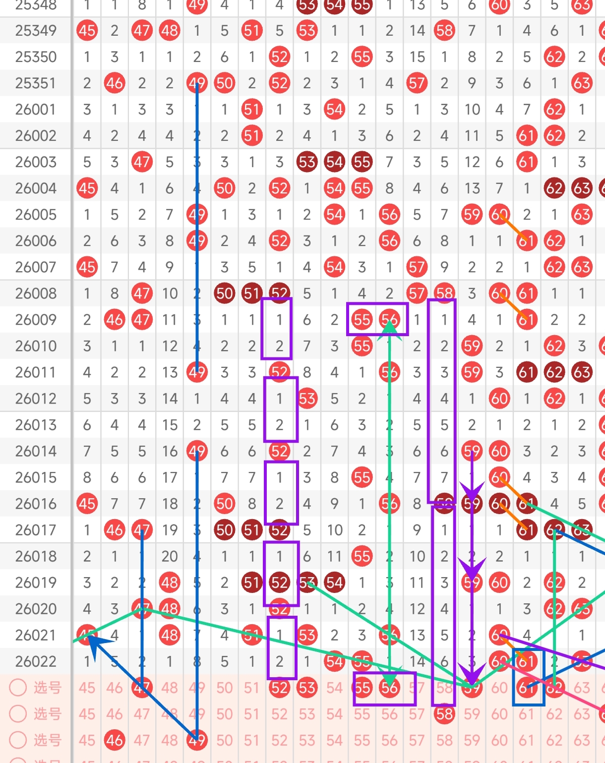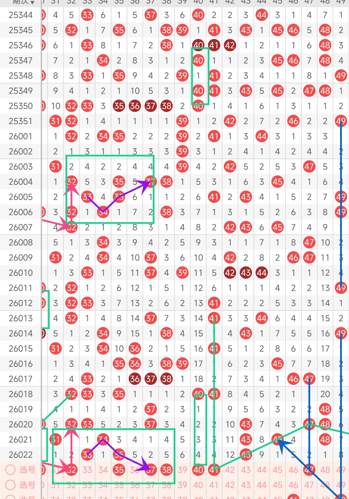 三区间上期开出四码,属于冷号区间,本期考虑补部分号码,注意部分对子码!41是一个间隔四码对称走势,本期考虑防一下!47是一个斜连形态落位,本期可防!52、53对子码考虑择一去做!55本期有重码落位和56是对子码,择一去做!59是一个斜连夹号加1、2、3下坠落位走势,本期考虑防一下!