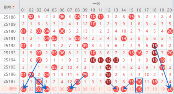 该区间的01号数字我们注意一下出号情况,属于三斜连号码,出号机会是有的。本期的04 07号数字我们防守一下出号情况,都是属于三斜连号码,是有机会出一个号码的,其中的07号数字可以重点关注一下。本期的13 14号数字我们也是要注意出一个号码的情况,其中的14号数字我们可以重点关注一下。上期开出了15 16 18号数字连号空一带号,本期我们注意一下出一个重号的情况,其中的16 18号数字我们可以重点关注一下。