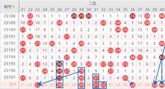 该区间23号数字是属于23 26 29号数字的斜连号码,出号机会是有的,我们可以关注一下出号情况。本期的26 29 31号数字我们注意一下出重号的情况,其中的26号数字我们可以重点关注一下。本期的32号数字也是属于斜连号码,出号机会也是有的,可以关注一下。上期开出了35号数字,本期我们注意一下带出36号数字的情况。本期的40号数字我们注意一下出号情况,本期可以防守一下39 40号数字同出的情况。