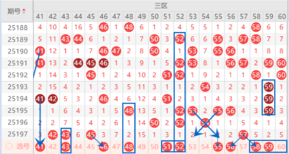 该区间上期开出了连号空一带号42 43 45号数字,本期我们注意一下出一个重号的情况,其中的43号数字可以重点关注一下,本期可以防守一下41 43号数字同出的情况。本期的46号数字123走势,我们防守一下出号情况,这里可以做一下46 48号数字同出的情况。本期的53 55号数字是属于交叉对称号码,是有机会出一个号码的,其中的55号数字我们可以重点关注一下。本期的58 59 60号数字是属于重号59号数字边号回补号码,是有机会出一个号码的,其中的58 59号数字我们可以重点关注一下。