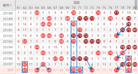 该区间上期开出了62 65号数字,本期我们注意出一个重号的情况,其中的62号数字可以关注一下。本期的64 66号数字我们注意一下出一个号码的情况,其中的64号数字我们可以重点关注一下出号情况。本期的67 68 70 71 72号数字都是属于遗漏1期的号码,本期我们要注意落下号码的情况,其中的70 71号数字可以重点关注一下。上期开出了78 79 80号数字的三连号,本期我们注意出重号的情况,其中的79 80号数字可以重点关注一下出号情况。