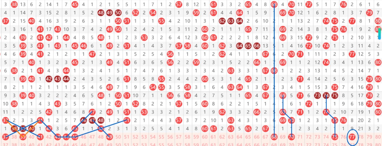 【第二区间41-80】:上期开出8个号码。本期推荐:41-43-44-45-49-68-70-75-77九个号码。41梅花形态号;43-44-45作为近期345尾连号在此代码段走热的周期出号考虑,且43斜连三期热形态,44斜连四期,和59期48同形态;45则为同路三期,将形成同路三重走势;49斜连三期和等距形态号码,且近期大热号码;68遗漏形态和周期出号考虑;70和75“闪电”形态号码,记得之前我曾在文章中命名过此形态名称,不妨作为防守号码;77主要考虑7尾的斜连延续。区间推荐重点号码:三小区间41-43-45,四小区间68-77。