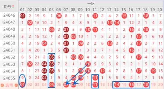 该区间的01号数字是属于遗漏9期的号码,本期遗漏9期的号码有5个,本期我们注意一下出一个号码的情况,重点关注一下01的出号情况就行了。本期的05 07号数字我们要注意出一个号码的情况,重点关注一下05号数字的出号就行了。上期开出了08 09 11号数字的连号空一带号情况,本期我们重点关注一下08 11号数字出重的情况。本期的14号数字是属于遗漏8期的号码,本期遗漏8期的号码有2个,本期我们注意出一个号码的情况。
