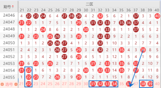 上期开出了23 26 29号数字,本期我们注意一下断号的情况,重点关注一下22 23号数字出一个重号的情况。上期的30 -40号数字之间断号了,本期我们要注意一下30 32 33 35 37号数字回补的情况,重点关注一下32 33 37号数字回补的情况。在该断号区间有两个冷号,我们要注意出一个号码的情况。本期的38号数字我们也是要注意一下的。