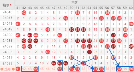 该区间的41号数字我们防守一下出号情况,本期的42 43 44号数字我们要注意出号情况了,本期落下一个号码是没有问题的,重点关注一下42 44号数字的出号情况就行了。上期开出了47 48 49号数字的三连号,本期我们注意一下走重的情况,重点关注一下47 48号数字出重的情况。本期的50 54号数字是属于交叉对称号码,本期我们要防守一下出号的情况。本期的58号数字是属于三斜连号码,可以关注一下的。
