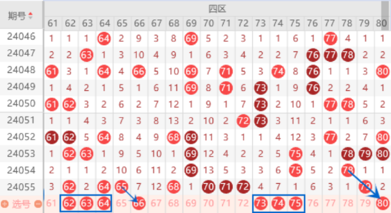 上期开出了62 64 65号数字,本期我们注意一下走重的情况,重点关注一下62 64号数字的重号。夹号63号数字我们也是要注意一下的。上期开出了68 70 72号数字,本期我们注意一下这里出现断号的情况,不易在这里定胆码。本期的73号数字我们注意一下回补情况,75号数字也是类似的情况,可以关注一下。本期的80号数字我们关注一下出号情况,属于三斜连号码,出号机会还是有点的。