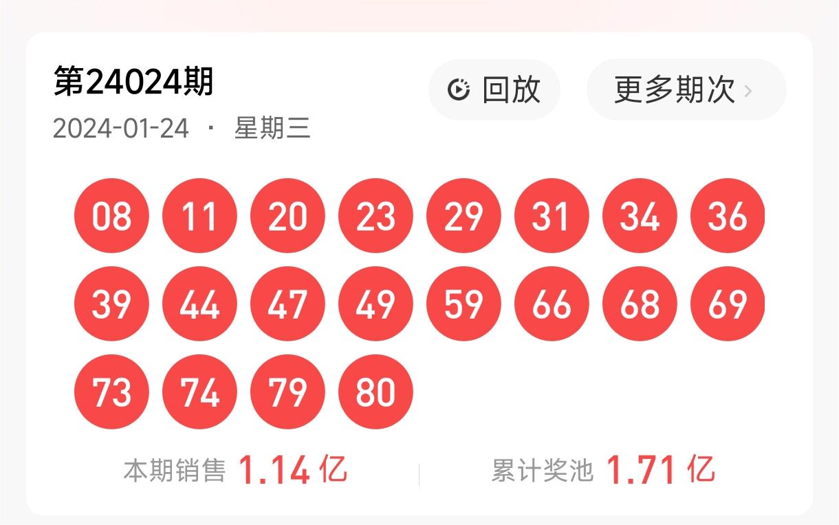 首先回顾上期的开奖号码:08 11 20 23 29 31 34 36 39 44 47 49 59 66 68 69 73 74 79 80