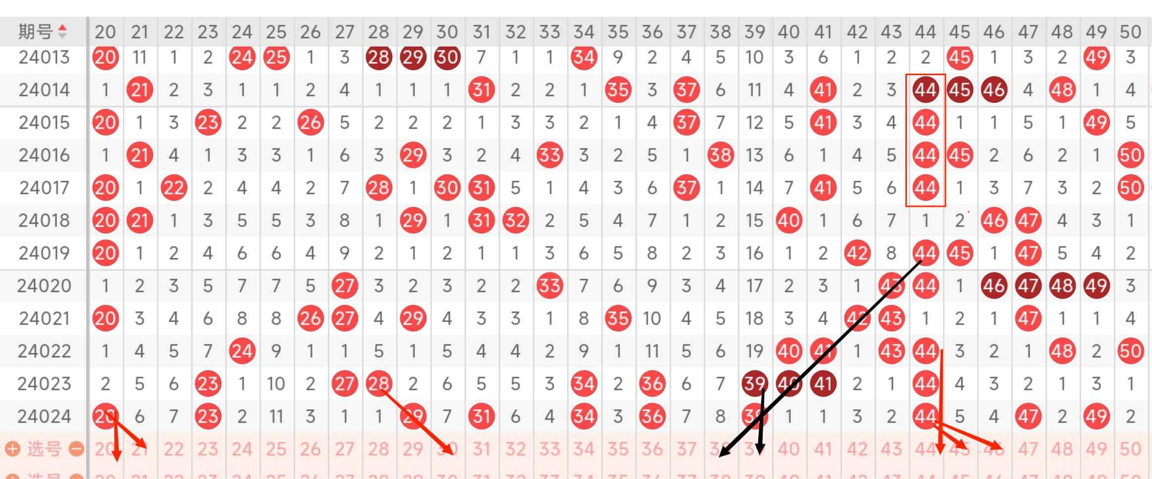 区间分析:二区在在24023期开出7个号码球和24024期开出6个号码球,热度是比较高的在这二期的走势中,连出走势的号码球有号码球23号球二连出和号码球34号球二连出和号码球36号球二连出和39号球二连出,二区的连出走势是比较强势的,本期的号码球23号球的三连出和39号球的三连出走势需要重点关注,预防号码球38号球的开出和预防号码球40号球的开出 ,斜开奖走势预防号球21号球和号码球30号球的开出!