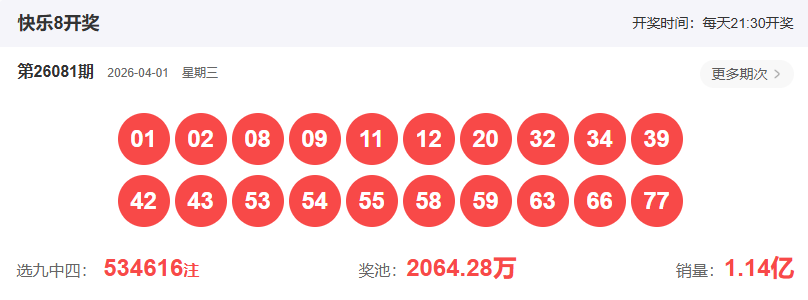 首先我们看下上期开奖结果快乐8第26080期开奖结果:01  02  08  09  11  12  20  32  34  39  42  43  53  54  55  58  59  63  66  77 ,和值为:738,大小比例为: 10:10,四区7:3:7:3,开出五组两连号,分别是:01+02, 08+09, 11+12, 42+43, 58+59,一组三连号:53+54+55直连重号出了6个,分别是: 11, 32, 34, 54, 59, 66,其中66连重号,其余均为两连重号,我们把01-40分为前区,41-80分为后区, 则上期大小号一样多,未开出冷号,均为热号和温热号。