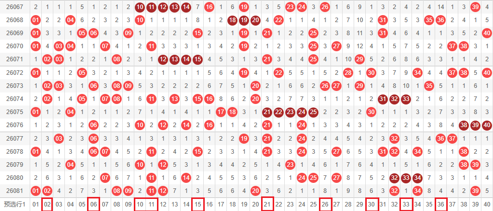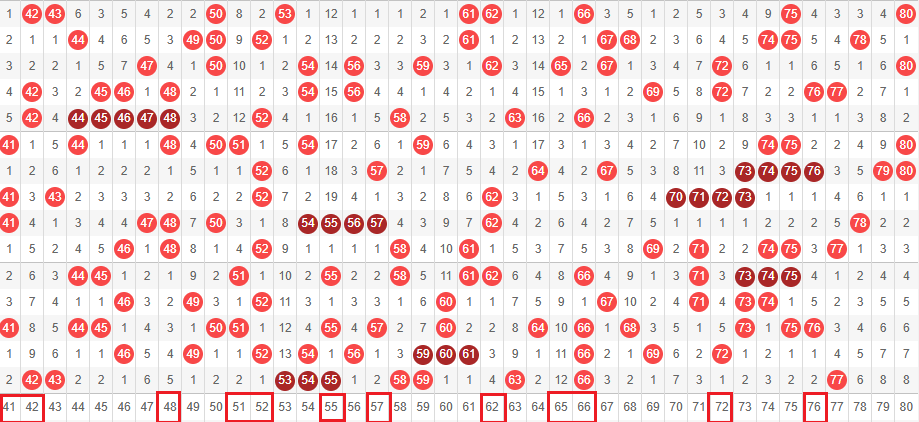 接下来我们一起看走势图,我们把01-40分为前区,41-80分为后区。