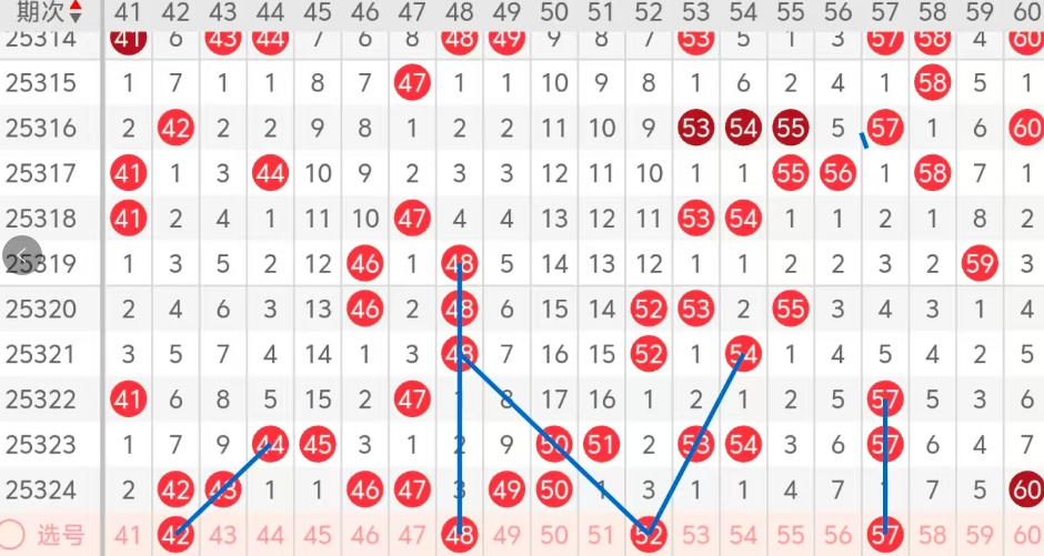 第三区间的走势分析:第三区间上期开出了七个号码球,主要的落号点位在三区间的前半区,走出了三奇四偶的形态走势,上期三区间的前半区落下了五个号码球,后半区落下了两个号码球,整个三区间处于走热的趋势,根据三区间的走势规律,今天的三区间我们主看42 48 52 57这几个号码球的落位,42走出了斜连码加重码的落位走势形态,48走出了封口的走势形态,52走出了斜连码的走势也是上下对称的形态走势,57走出了重码隔期回补的形态走势,与28 39的走势一样,这四个号球有两个冷码的回补和两个边码的落位,参考为主!