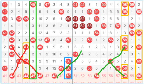 第三区间号码41-60,三区前期走热,中间冷了一下,上一期似乎让人感觉到它要回暖了,但是这种走热真的不是看好的研究区间,用回光返照来形容似乎更合理一点。但这并不排除在上一期空白区间作号的看好性。例如41-49之间的4648