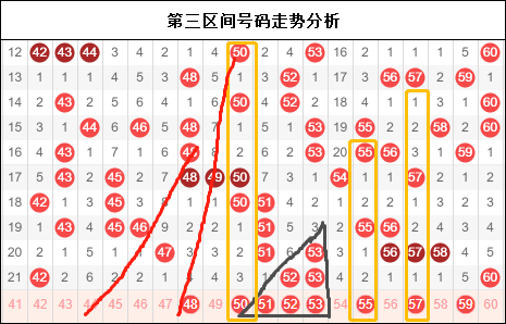 第三区间号码41-60,三区依然如我们所讲,维持着不冷不热的走势。每一期都没有让人失望过,连号重号依然充斥着每一期的开奖号码。所以接下来在整个周期变化的过程中,可以把目光聚焦到这里。接下来这里将会是我们施展报复的地方,就看运气正不正了,当然少不了前半段冷号的防守。