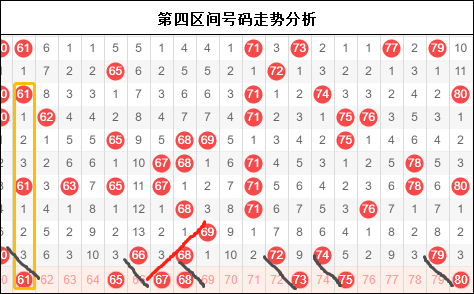 第四区间号码61-80,四区五个号码中出现了四个冷号,也是337期开奖号码最亮眼的地方。虽然这样的号码对我们来说杀伤力巨大,但无疑给下一期做好了伏笔。338期这里可以根据走势注意两个方向,一是冷号的持续,也就意味着邻号出现的可能性大一点,另一方面注意冷号本身在这里形成重号出现。