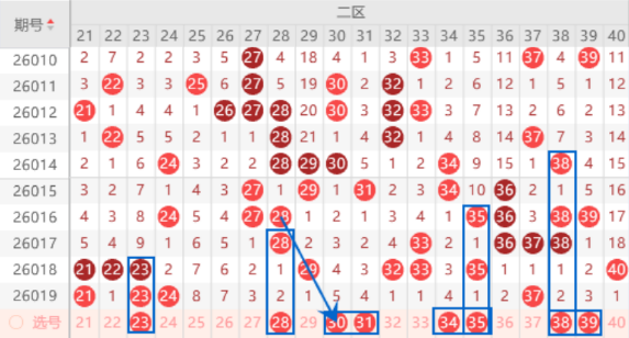 该区间上期开出了20 21 23 24号数字的连号空一带号,本期我们注意一下出重号的情况,其中的23 24号数字可以重点关注一下出号情况。本期的27 28号数字我们注意一下出一个号码的情况,其中的28号数字可以重点关注一下出号情况。本期的30号数字是属于三斜连号码,出号机会是有,可以关注一下。连号空一带号32 33 35号数字我们也是要注意落下一个号码的情况,其中的35号数字是属于空一对称号码,本期可以防守一下34 35号数字同出的情况。