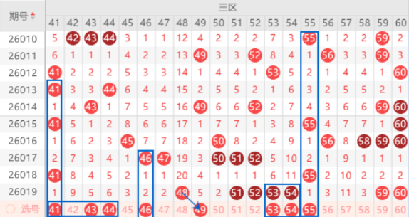 该区间41号数字是属于121对称号码,本期是有机会出一个号码的,本期可以防守一下41 43号数字同出的情况。本期的46 47号数字我们注意一下落下一个号码的情况,其中的46号数字可以重点关注一下出号情况。该区间上期开出了51 52 53 54号数字的四连号码,本期有可能断号,本期这里做一下防守就行了,其中的53号数字可以重点防守一下。本期的55号数字是属于421走势号码,出号机会是有的,可以关注一下出号情况。