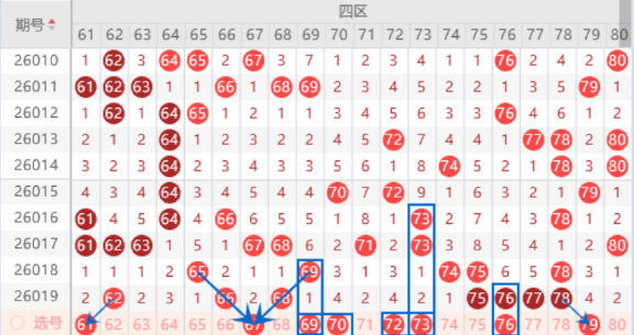 该区间的61 67号数字都是属于夹号,本期我们注意一下出一个号码的情况,其中的67号数字可以重点关注一下出号情况。本期的69 70号数字我们注意一下出一个号码的情况,其中的69号数字可以重点关注一下,本期也是可以防守69 70号数字同出的情况。本期的73号数字是属于292对称走势号码,本期不一定会出号码,我们做一下防守就行了。该区间的四连号75 76 77 78号数字我们注意一下出重号的情况,其中的75 76号数字可以重点关注一下出号情况。