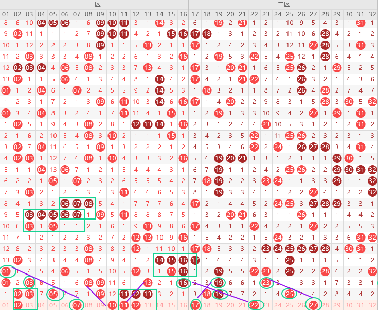 二区胆尾7尾2尾9尾,边号17 8 19 20 24 26出1-2码,重号18 19 25三出一,形态上17 22 27是斜连号,上图已勾画,重号先看25其次19,算周期2尾要回补一码22 32二出一,9尾最热出3期大概率19 29二出一,结论关注五码17 20 22 27 29