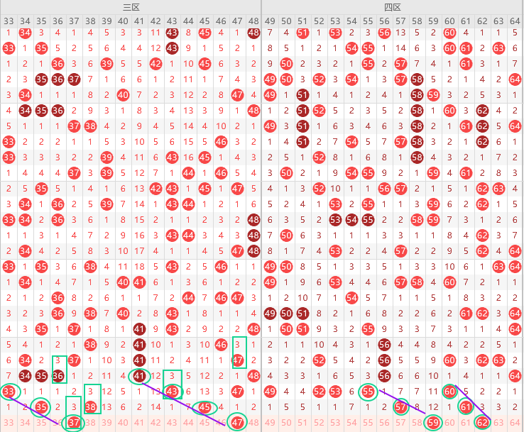 三区胆尾3尾4尾,边号34 36 37 39 44 46出1码,重号35 38 45出一码,形态上37 47是斜连号,上图已勾画,短期规律隔3期号出多期本期只有37,37可以防守,上图已勾画,其次隔一期号出2期本期33 43 47是隔一期号,不看好47那就是33 43二出一,同尾号出2期本期防守36 46同尾号,结论关注五码33 34 36 43 46
