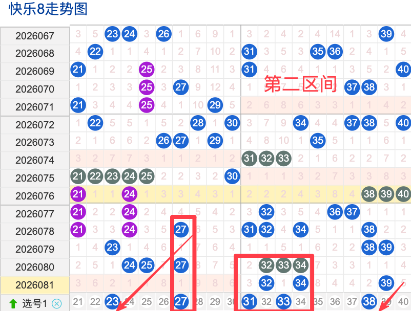 上期二区开出3个奖号(32.34.39)上期回顾二区开出3个奖号二区间在上期落位同比前期的话呈现了一个递增减落位趋势,先来看本期号码23整体活跃度较一般,在近 30 期里有一定的间歇性出现,不是每期都开,近期整体走势还不是很稳定。号码27近期热度较热,间隔性整体比较热,说明其在当前阶段活跃度较热注意防守。号码33近期活跃度较冷有一定的间歇性近期整体走势相对还不是很稳定有特别明显的冷热趋势变化,号码38近30期内活跃度较热,没有明显的连续出现形态走势,整体表现比较热。