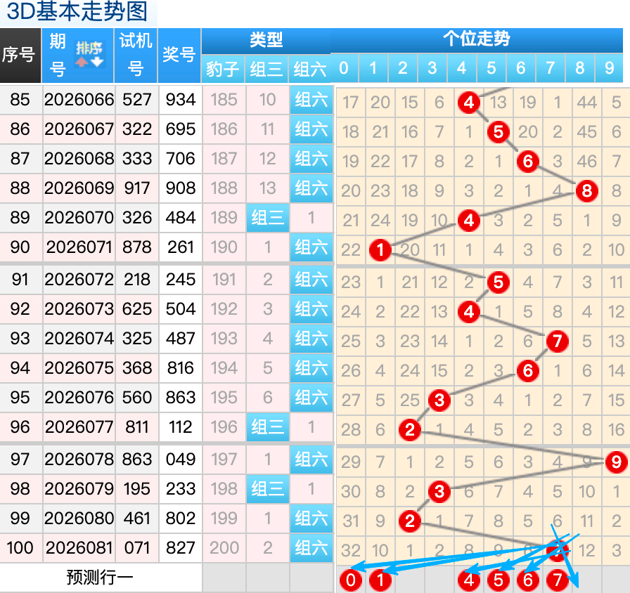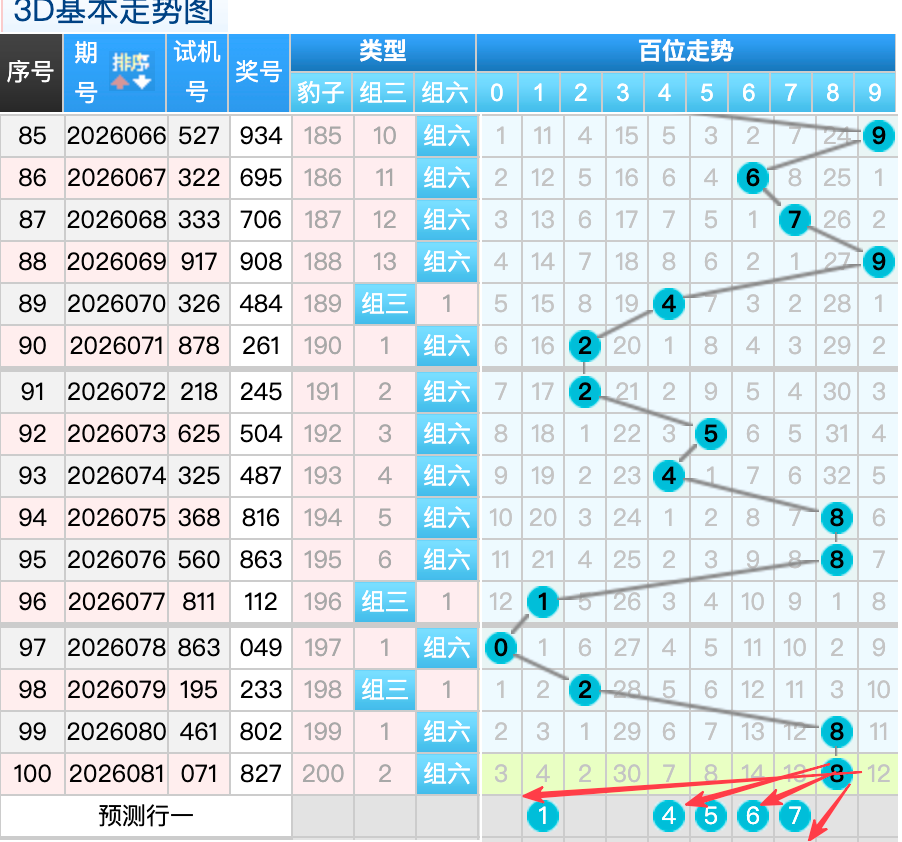 3D上期百位开出8球,这个奖号8是一个重号码的回补落位趋势也是一个比较好的符合百位上的落位点,先看7号球这里还是有机会继续走出一个大号码的分边回补趋势还是要注意防守的,还有一个就是1号球这里的是冷码间隔四期的落位形态在这里的机会还是很好的要注意防守,然后2号球这里要注意是一个折返回补落位趋势注意防守,5号球和3号球在百位上要注意可能有机会走出搭配的号码回补的概率 。