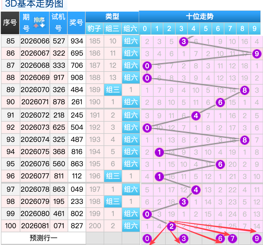 上期3D十位开出的奖号是2号,上期在十位上2号球这个号码是一个冷号码的落位点,本期来看3号在十位上要注意这个号码是有机会继续走出顺位落位的趋势这里的号码回补形态注意防守就好,再来6号球这个点位注意防守走出常搭配的热码落位趋势。9号球这个号码是小号拉拽大号的落位码回补要注意参考。0号球要注意走出折返码的概率