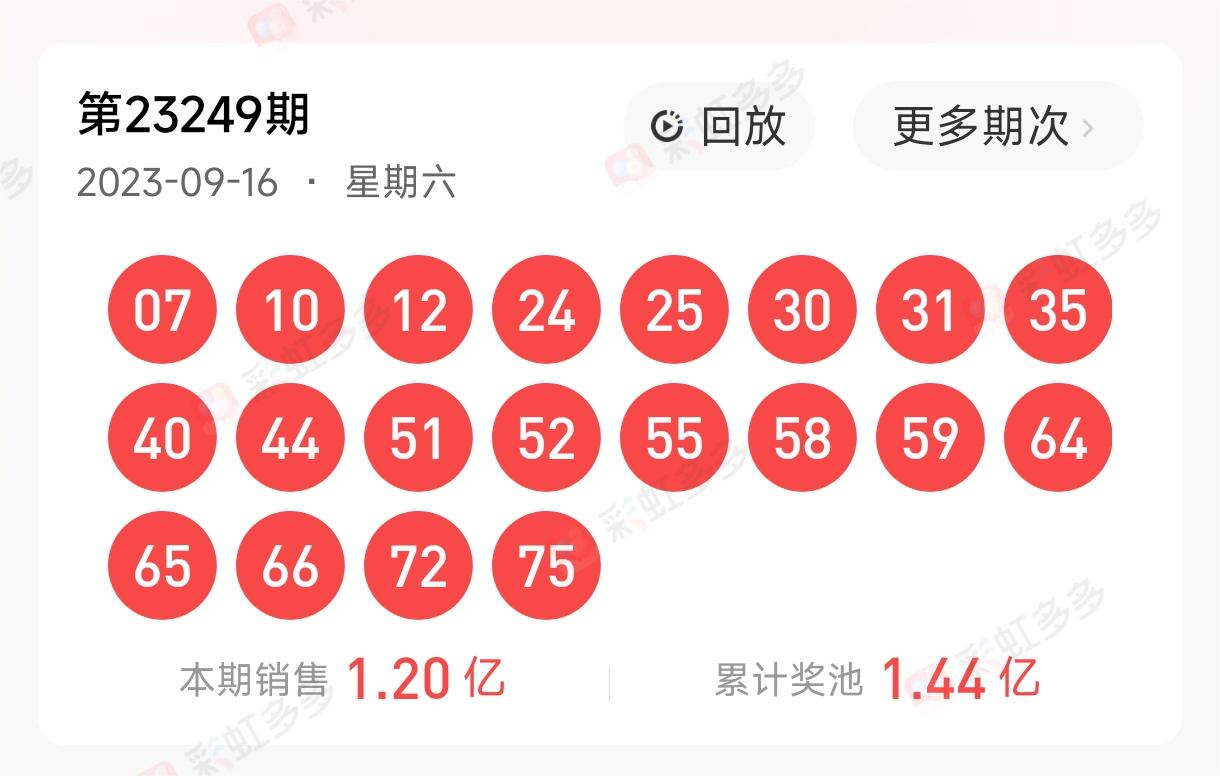 首先回顾上期的开奖号码:07 10 12 24 25 30 31 35 40 44 51 52 55 58 59 64 65 66 72 75