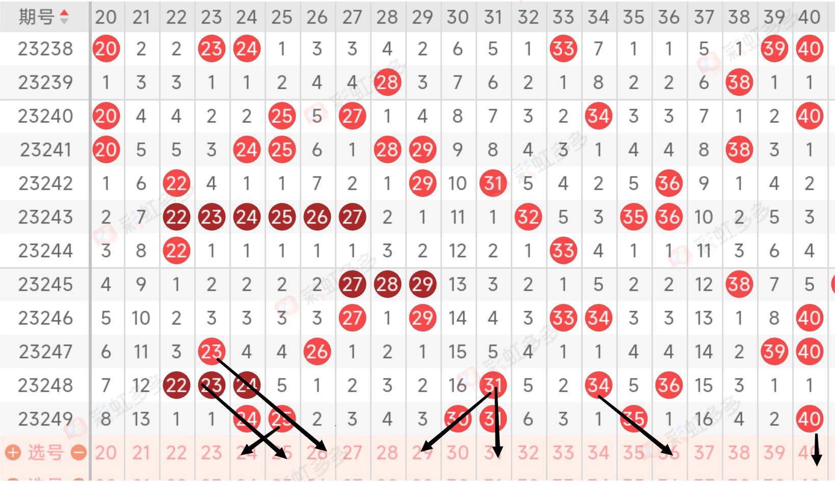 区间分析:二区在近期是比较温码区开出的号码球会有部分号码球连出,上期开出6个号码球,其中24号球二连出和31号球二连出和40号球的开出,二区的整体热度在渐渐上升中,本期的二区步入温码区可能会开出5个号码球,二区近期的主要出码是22号球和23号球出现的次数比较多,预防22号球和23号球的继续连出,本期的号码球重点看24号球的三连出和25号球的二连出和斜开奖趋势25号球开出以及29号球的开出和36号球的开出和40号球的二连出!