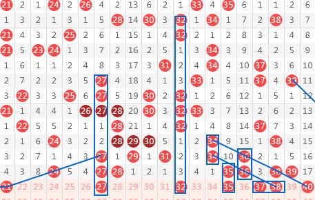 【第二区间21-40】:上期开出7个号码。本期推荐号码:27-32-35-37-38-40,27重码和上下对称考虑,32作为断2尾回补,并组成2-5-8同路形态号码带出37,同时37为奇数斜连四期,走势明显,38与40为偶数二连的延续。二区间推荐重点号码:27-32-35-38-40。