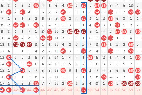 【第三区间41-60】:这个区间上期开出6个号码。本期推荐号码:41-43-45-52,41遗漏一三期形态,43则为错位上下出号走势,也是本人定义的“闪电”号码出号形态,52遗漏二三期形态。三区间推荐重点号码:41-43-52。
