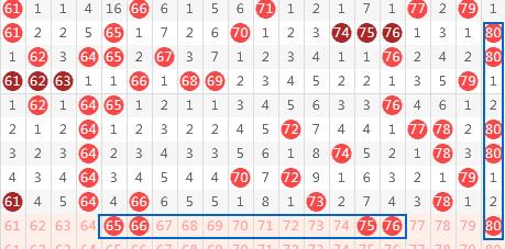 【第四区间61-80】:这个区间上期开出5个号码。本期推荐号码:65-66-75-76-80,65-66-75-76首先以区间同尾对子号码考虑,拆开来分析,65从出号周期看,近百期平均遗漏4期出号,截止2026016期刚好遗漏4期,开出概率较大,而66为此小区间偶数号码重号延续考虑,75为遗漏7期防守号码,76为同路形态,80偶数斜连和1-2-2-1形态。四区间推荐重点号码:66-76-80。