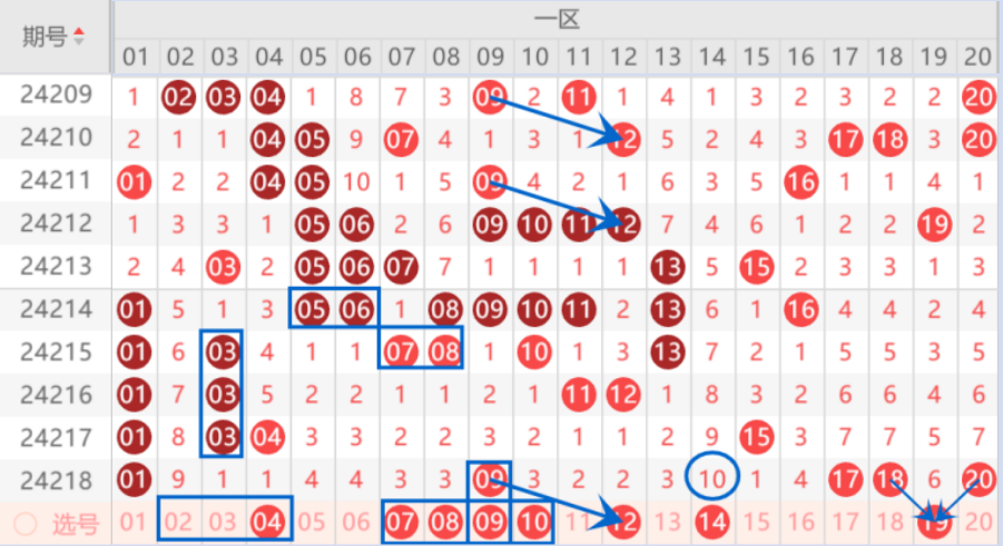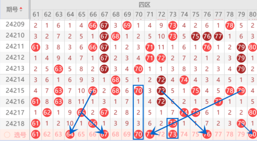 本期的02 03 04号数字我们要注意一下出号情况,属于重号边号回补情况,最近这种类型的号码都是空一期就回补了,本期我们重点关注一下02 04号数字的回补情况,本期的04号数字是属于151走势,本期的151走势有两个号码,本期出一个的机会很大。阶梯号码05 06 07 08号数字就像阶梯号码23 24 25 26号数字一样,本期是存在断号的风险,不建议定胆。本期的14号数字是属于遗漏10期的号码,本期遗漏10期的号码有3个,本期出一个的机会是很大的,我们重点关注一下14 64号数字的出号情况就行了。