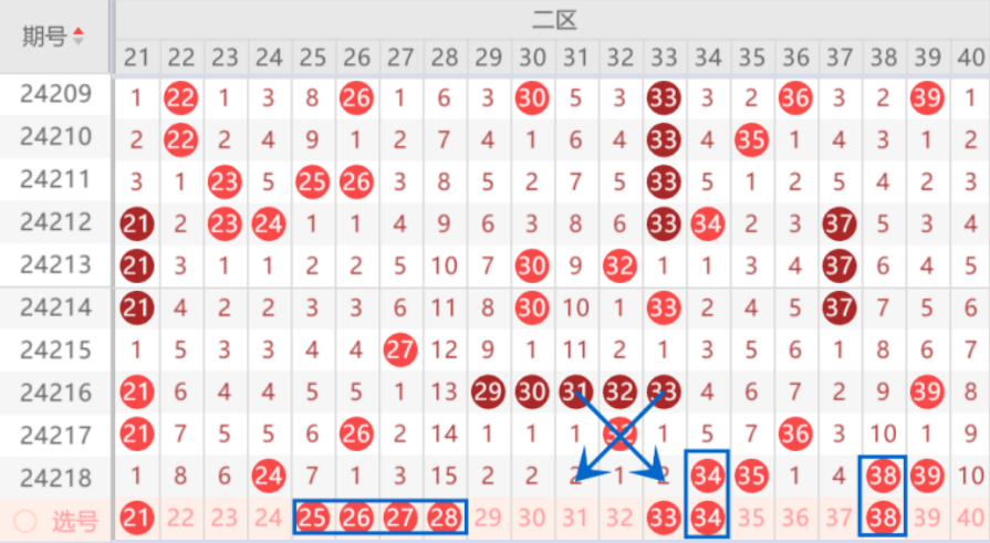该区间的22 25 28号数字是属于2路号码,断号5期了,本期出号机会是很大的,本期的22号数字出号机会不是很大,重点关注一下25 28号数字的出号情况,本期的28号数字是属于遗漏15期的冷号,出号机会很大,这里可以防守一下27 28号数字同出的情况。上期开出了连号34 35号数字和连号38 39号数字,本期这里是要开出重号来的,我们重点关注一下34 38号数字的出号情况就行了。