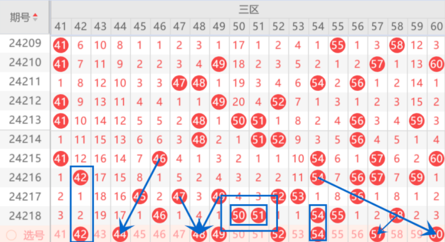 本期的冷号40 43 44号数字我们要注意出一个号码的情况,其中的43 44出一个号码的几率是非常大的,43号数字在42 49号数字没有同出前是很难开出来的,所以本期的44号数字我们要重点关注一下。上期开出了连号50 51号数字和连号54 55号数字,本期我们也是要注意出重号的情况,重点关注一下54号数字走重的情况。