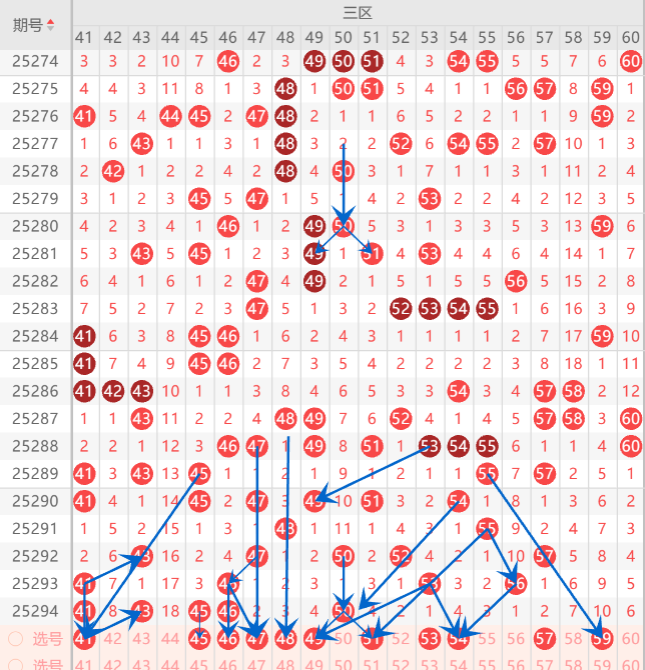 而三区的打底号是41.42.43.46.47.49.51.53.54.59.56.57参考3-4码开出机会,