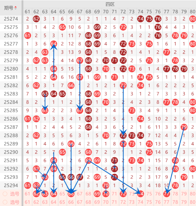 四区在近期的走势上来判断机会的话,整体区间是走热形态,上期四区间区开出了4码,而且上期区间开出的形态是斜连号和对称形态走势,上期小妹在文章中布局到了3码开出,那么本期四区间重点关注的形态是对称形态,隔期回补,重码走势,那么本期的对称形态上注意63.68.72.80中开出1-2码机会,而隔期回补上注意63.65.67.69.中参考一码开出机会,至于重码上注意62.61.70中开出一码机会,而本期注意防守空位回补上的64.73.75.中防守一码开出机会,如图所示。