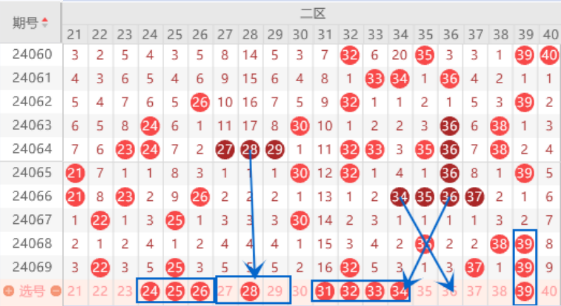 上期开出了22 25号数字,本期我们注意一下出一个重号的情况。本期的24 26号数字我们也是要注意一下的,所以这里我们本期注意一下出连号的情况。本期的32号数字我们注意一下走重的情况。本期的34 36号数字是属于交叉对称号码,上次的33 35交叉对称号码都出了,所以本期的34 36号数字的应该也是会出一个号码的。本期的39号数字我们防守一下走三重的情况。