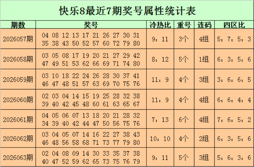 福彩快乐8第2026063期开奖回顾:02 04 08 09 14 30 33 35 37 38 40 47 52 59 62 65 73 75 76 79,其中奖号冷热比为9:11,开出5个重号:04、14、38、73、79,四区比为5:6:3:6。