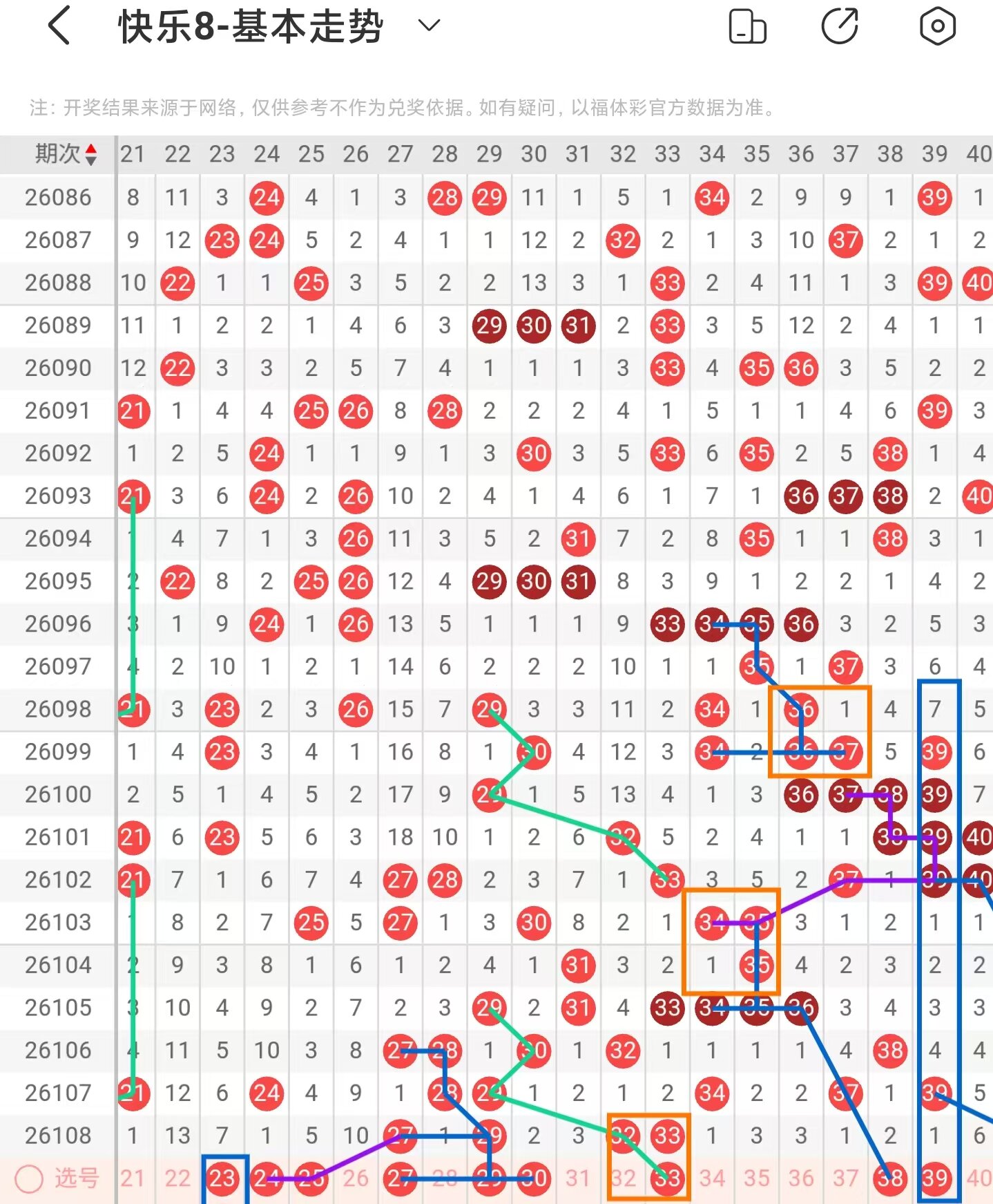二区间大面积减少落号,一共开出四个号码球,本期考虑增加号码球的数量,注意阶梯落位重码走势的23号码球,近期27、28、29号码球的走势与37、38、39号码球的走势相似,本期注意24、25号码球,近期34、35、36号码球的走势与34、35、36号码球的走势相似,本期注意27、29、30号码球,以30号码球为对称走势起点,注意走势形态的29、30、31、33号码球,注意近期28、29号码球同期下落,下期回补32号码球,再到下期回补33号码球,两码同落下期回补一码的走势注意33号码球,注意斜连走势回补的38号码球,注意隔期递减的39号码球,因此二区间关注24-29-30-33-38,注意本区间的选二复式29-30-33。