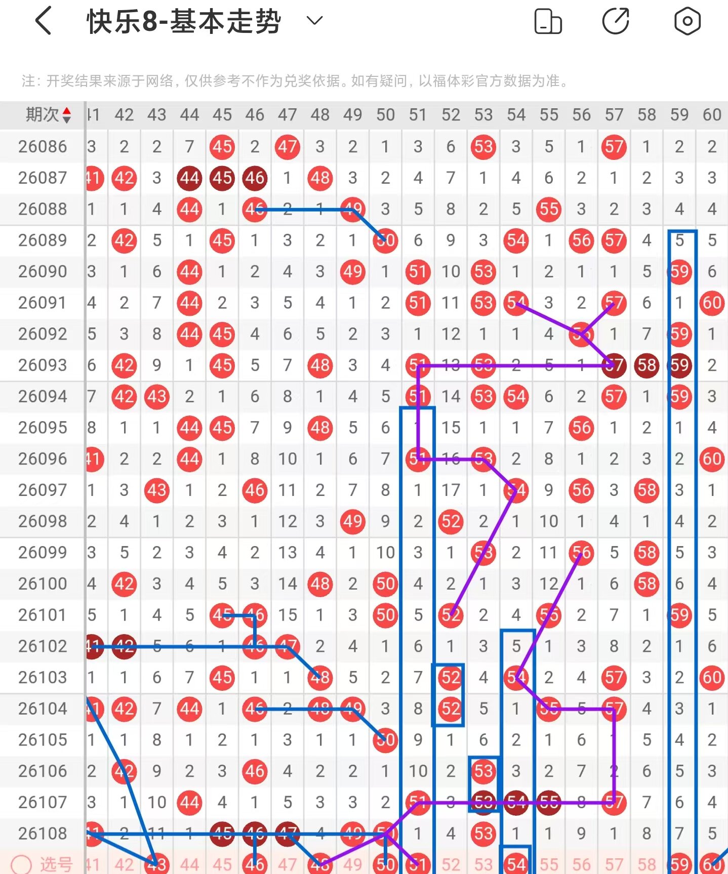 三区间上期稳定落号,一共开出七个号码球,本期考虑减少号码球的数量,注意斜连走势回补的43号码球,近期41、46、47号码球同落,下期回补48号码球,45、46号码球同期下落,下期重落回补一码,46、49、50号码球同期下落,下期回补50号码球,注意隔期对称回补的51号码球,同时也是百期相似形态号码球,近期51、52、53、54号码球的走势与54、55、56、57号码球的走势相似,本期注意48号码球,阶梯落位重码走势注意54号码球,同时也是隔期递减号码球,注意期数和值加减法的59号码球,注意斜连走势回补的60号码球,因此三区间关注46-48-50-54-59,注意本区间的选二复式48-50-54。