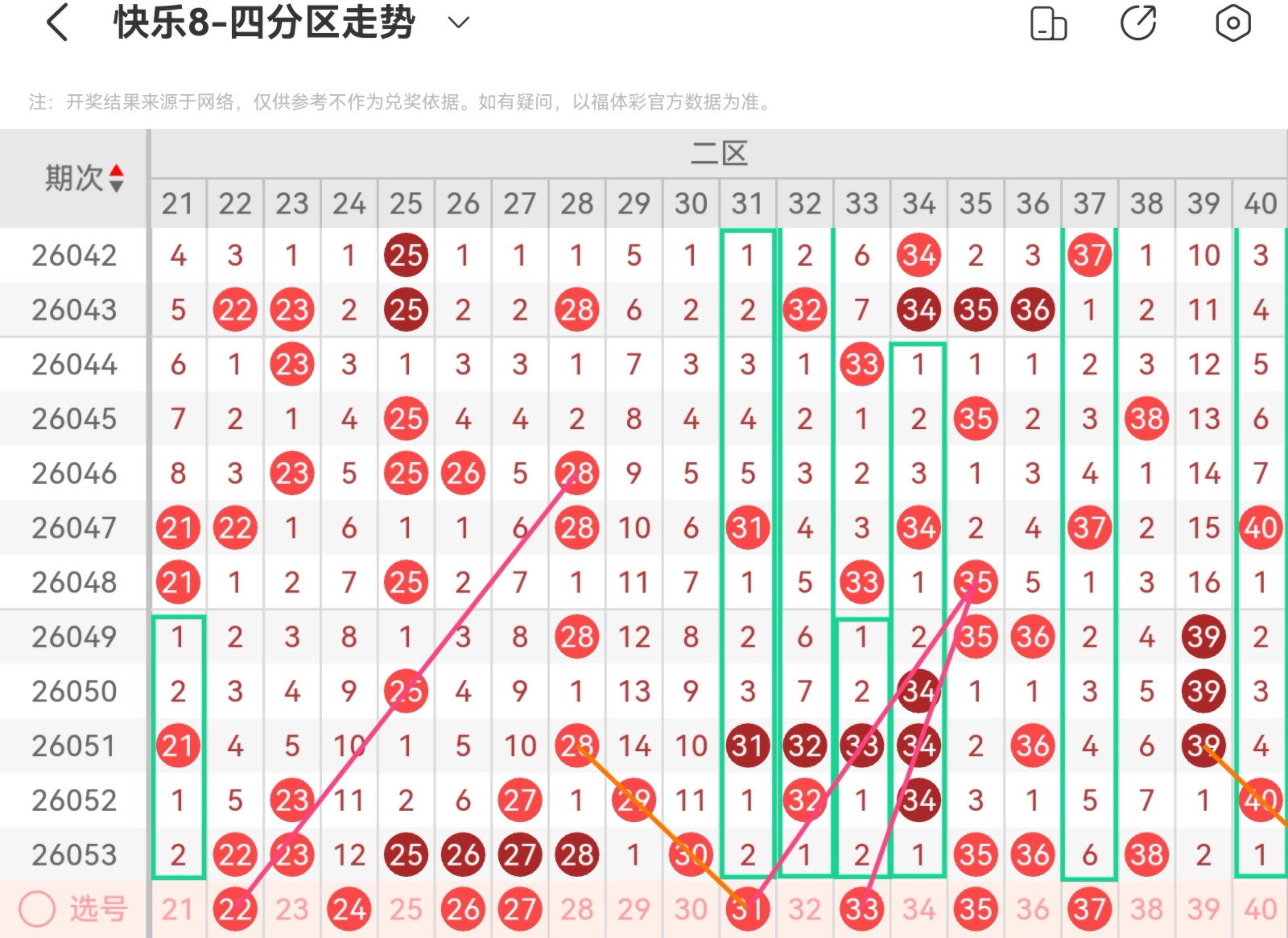 上期开出码,区间平稳,本区防3-5码开出。上期重号开出两码本期重号防一码开出,注意22.26开出重码的可能大遗漏号24上期形态走势开出七码,本区形态走势有:21.31.32.33.34.37.401-3码, 重点关注21的隔期空二走势,31532走势,33的隔期空二走势以及37146走势,小防32271走势以及34321走势上期空位走势开出三码,本区空位走势有:空一21.24.29.37,空二39.40,共六码防上期斜连走势开出三码,本区斜连走势有:三斜连21.27.29,四斜连25.31.36,共六码防本区注意重号、连码以及空位号码,隔期号码回补开出。