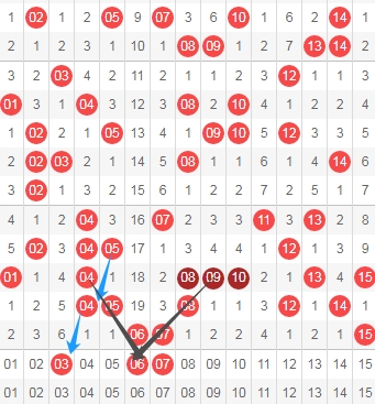 上图是福彩快乐8开奖号码走势分布图其中一部分,我标注出来的数字03看蓝色箭头是隔一期斜连号码,我标注出来的数字06 07看黑色箭头都是斜连号码,这里三个数字03 06 07。